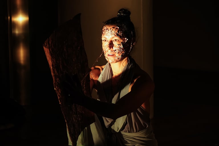 Copper, known for its exceptional conductivity, is integral not only to the transportation of electricity but also in Yogic subtle anatomy, it is associated with the heart centre and the circuitry of life energy. Through the synergy of dance and copper, Dressed in Water manifests the alchemy of spiritual and energetic transduction, connecting elemental forces with the physical dimensions of being. The audience becomes more attuned to the profound vitality of water in their own bodies, reealising that they participate in the living element that assures the future of life on earth.
