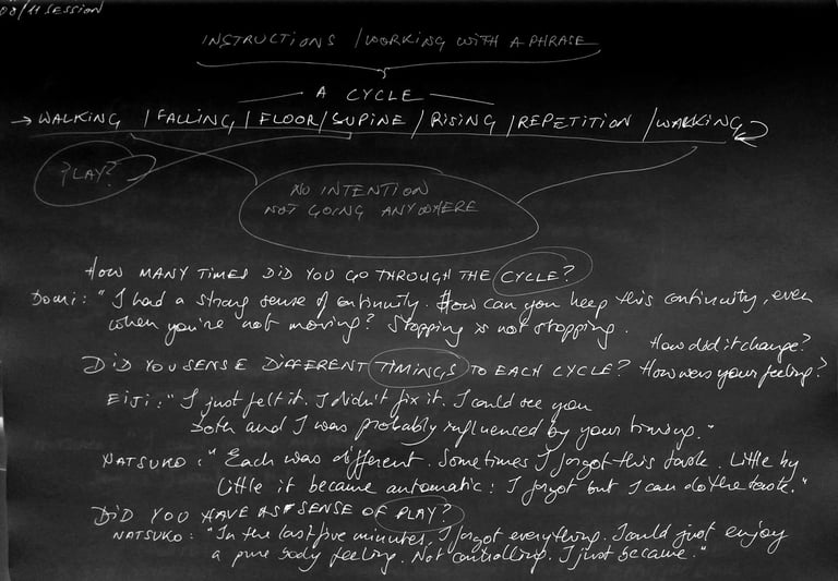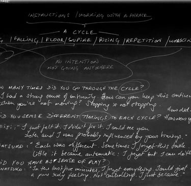 Just as when I first discovered Collapse, the tension I am holding begins to surface in a feeling of wobbling. The task is to observe, to do nothing, to let it appear. As expected, I can feel my weight pulled by gravity. What could this movement of liquidity become? How does a body move without will or intention — when even the act of letting go is itself an act of will?