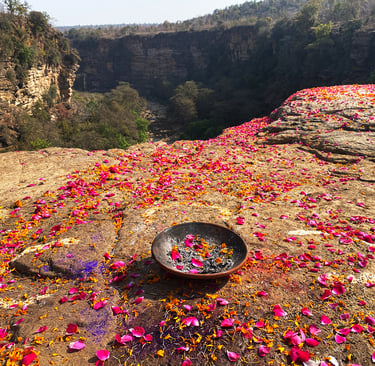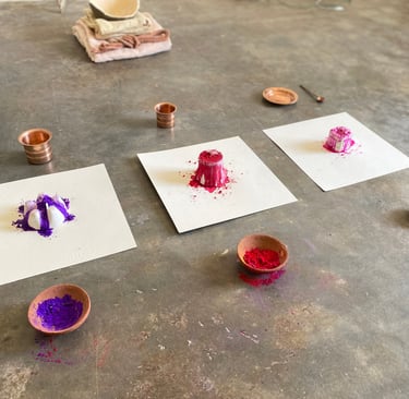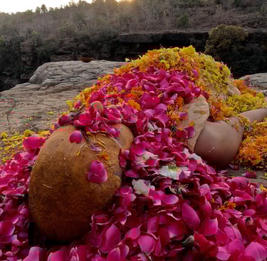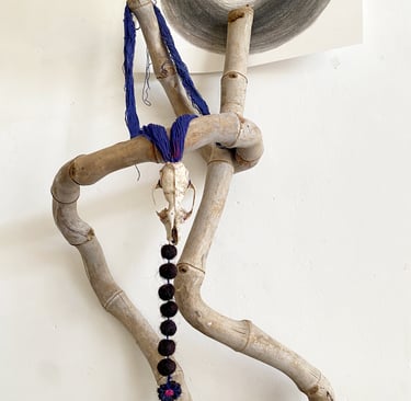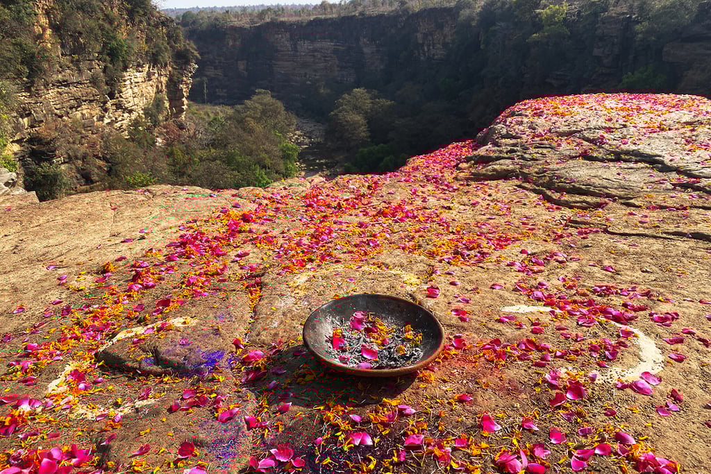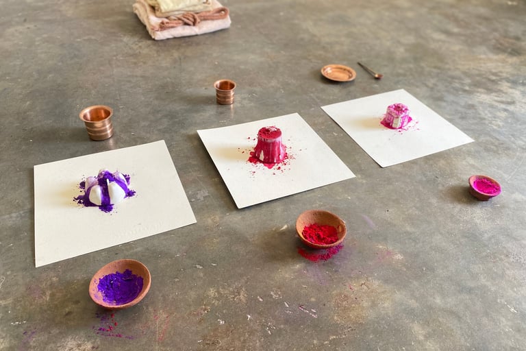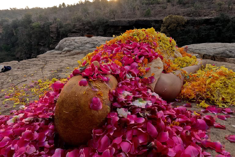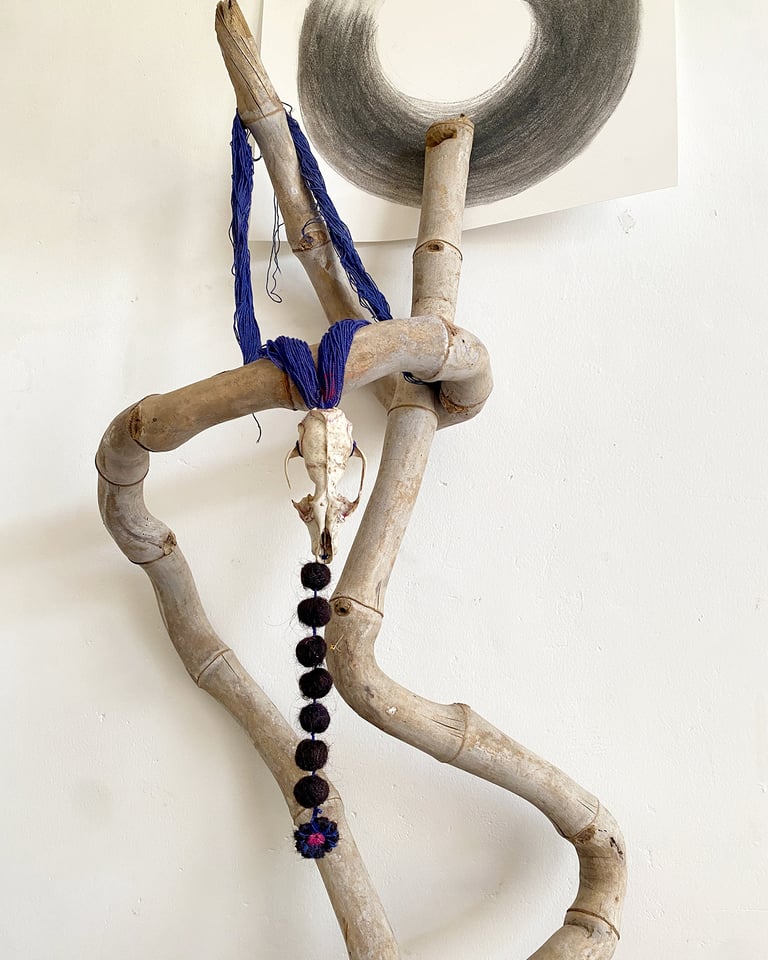 Body, voice, flowers, clay, fire, ash, bells, cotton dyed with palas flowers, turmeric, plaster, wood, hair, yarn, civet cat skull, cow bones, vulture feathers, ink, paper, colour pigment, water, dimensions variable